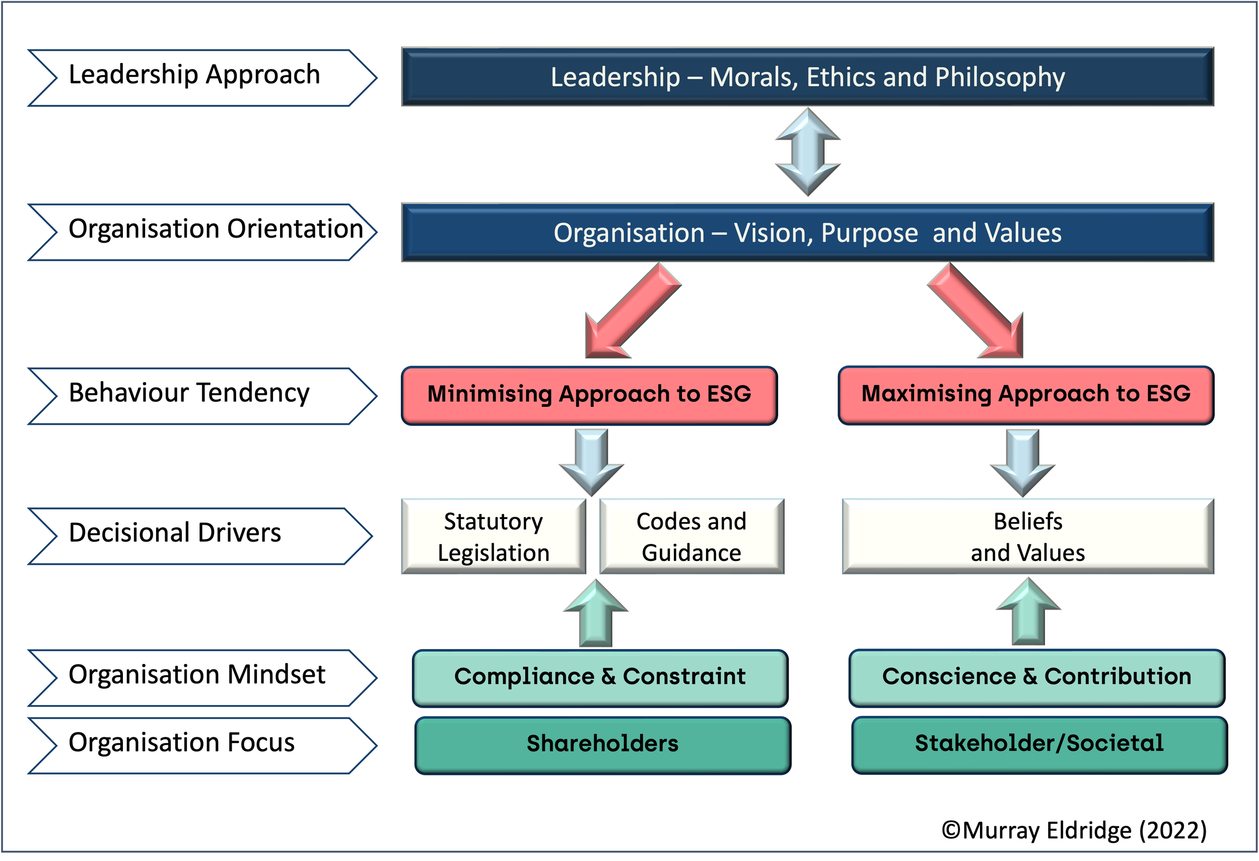 With the leader and organisation EG approach/orientation clarified a broader ‘organisational behaviour’ decision has to be made. Will it be behaviour designed to meet the minimum ESG criteria and standards and no more? Or will it be a ‘high road,’ exemplar approach seeking to maximise its ESG goals? Whichever route is taken the decision will inform the organisation’s mindset and focus, which in turn will determine how the decisional drivers will be interpreted.